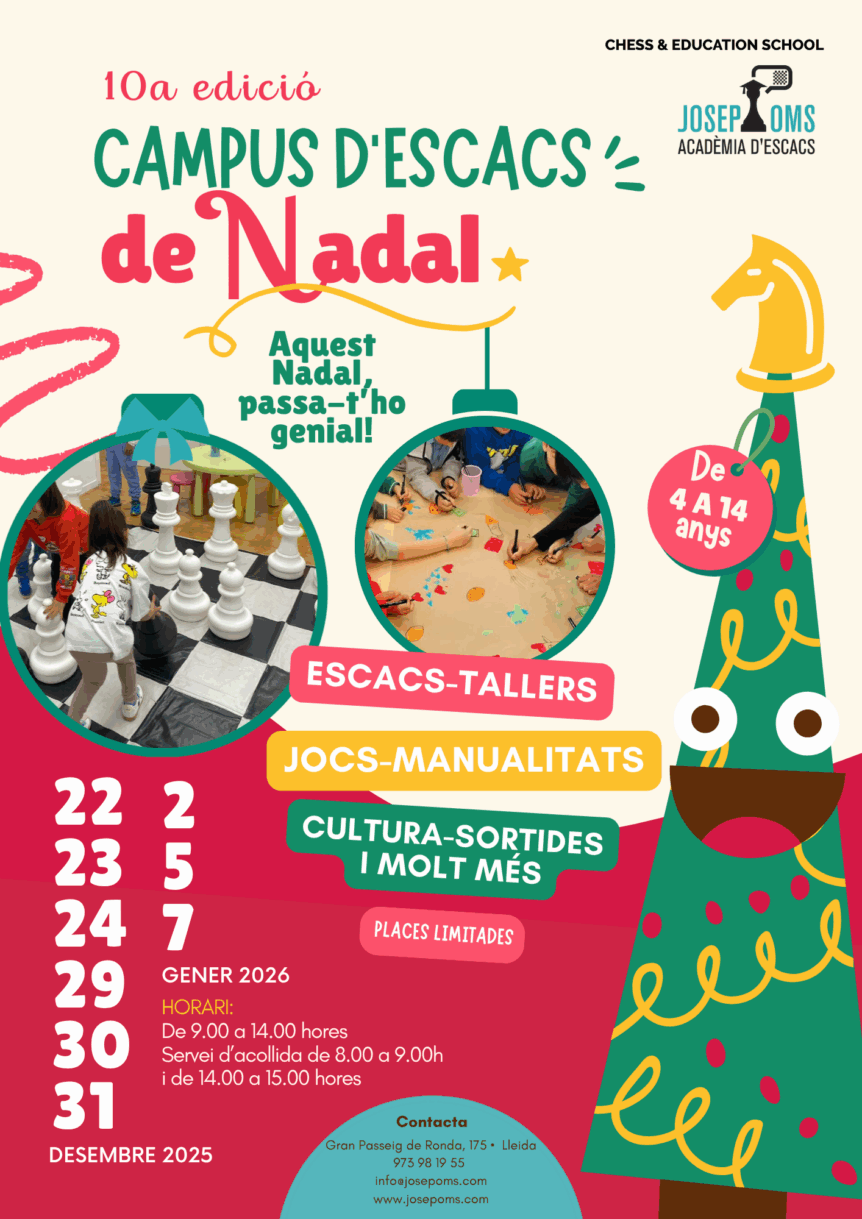 Aquest Nadal arriba la 10a edició del nostre Campus d’Escacs, un espai on l’aprenentatge i la diversió van de la mà! Si busques un lloc on els nens i nenes puguin passar uns dies plens d’activitats, sorpreses i bons moments… l’ADEJO és la vostra destinació per aquestes festes!